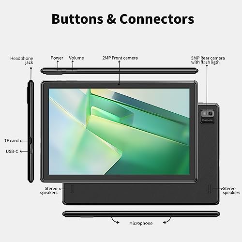 - 【Portable and Lightweight】With a portable design and a thickness of only 9mm, the Android Tablet is a stylish, lightweight tablet that you can carry around your home or anywhere. It has dual front and rear cameras (2MP+5MP), so you can take photos whenever you want, or video chat or video conference. The 2 stereo speakers on the bottom are loud enough for online learning and video calls
